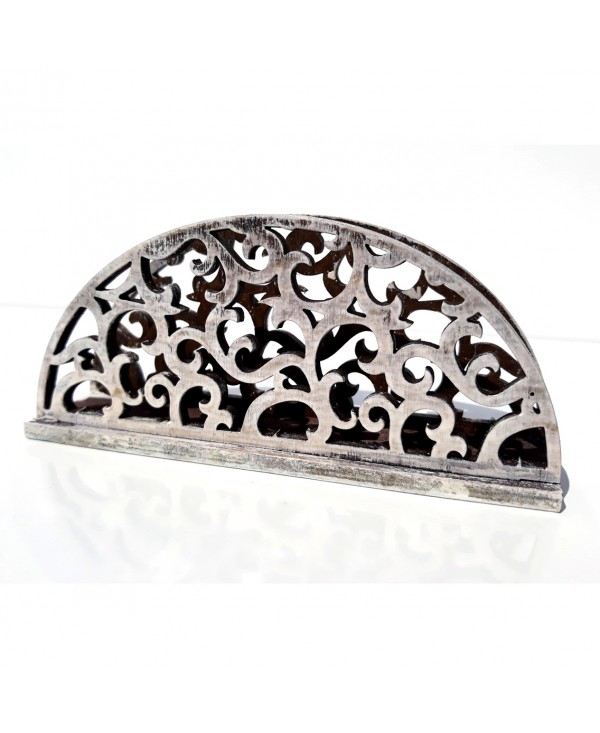 Serwetnik ażurowy wykonany ze sklejki drewnianej, zdobiony kilkoma warstwami farby. Wymiary: 5,5 cm x 12 cm x 3,5 cm.