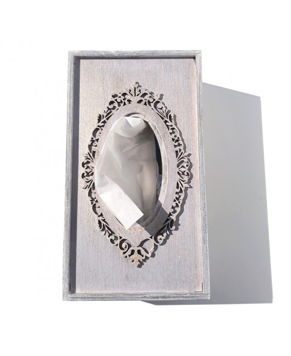 Chustecznik z ramką wykonany ze sklejki drewnianej, zdobiony kilkoma warstwami farby. Wspaniały przedmiot, który jest funkcjonalny i dekoracyjny. Wymiary: 9 cm x 25 cm x 14 cm.